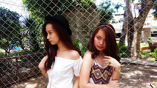 Here's a taste of what I think a modern minimalist boho chic look like, as I call it. Tina was wearing a white off-the-shoulder top paired with a plain white ripped shorts, wearing a fedora hat to complete the look. Whereas Nika is wearing an aztec patterned tank top with the good old denim shorts which usually and always supports any look or outfit.